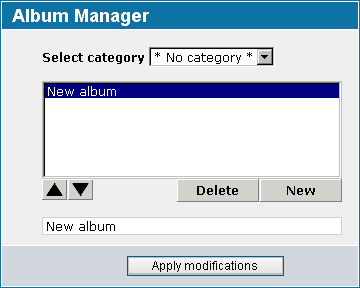 deleted but you can edit its title and description by using the You can specify how you want categories sorted in coppermine: alphabetically (instead of a customized order) by setting "Sort categories alphabetically" to "Yes". This setting is available both in coppermine config and the category manager. If you enable alphabetical sorting, the move up and move down arrows that normally let you manually sort the categories will disappear. Disable this feature if you want to organize your categories in some other order. You can only assign a picture to the category only if you have an album with images nested directly within it. 4.6 The Album ManagerCoppermine stores files inside of albums, so you'll need at least one album for your pictures/files to be placed in. Albums can be stored in categories (but they don't HAVE to be in a category, they can just as well go into the coppermine "root"). When you click on "albums" in the admin menu, you will see the Album Manager. 4.6.1 Creating albums