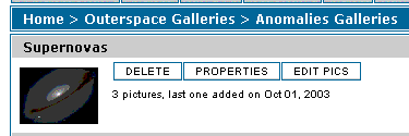 If you don't plan to have many albums, you really won't need to use the categories feature. If this applies to you, simply do not create any categories and all your albums will automatically appear on the main page of the script. There is, however, a special category named "User galleries". This category can't be deleted. If a user belongs to the group "can have a personal gallery" and this is set to YES, he will have the right to create his own albums and his gallery will be a sub-category of "User galleries". This link is not visible to visitors of your site, however, if you do not allow users to upload pics and have their own albums. The administrator can create albums in any category. Non-administrative users can only create albums in the "User galleries/Their_username". You can, however rename the "User Galleries". To rename the "User galleries" category and description, simply go to your category control panel and change the name there (e.g. to translate the words "User galleries" into your language). 2.2.4 Your admin account