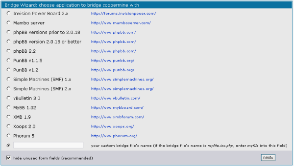 If you have a custom-made bridge file that is not available in the wizard, choose the radio button in front of the text field and enter the name of your bridge file there, without the extension ".inc.php" (the bridge file must reside in the coppermine sub-folder "bridge"). The next steps depend on the application you have chosen to bridge with: some applications need URLs to be entered, or paths. Some need mySQL table information or cookie data to be entered, others don't. The point of the wizard is that it will only "ask" you the relevant settings for your application - if one or more items of the following description doesn't turn up for your application, there's no need to worry - just keep filling in the mandatory information and then hit "next". However, you have to understand that coppermine can proof-check only some of your input - some input goes unvalidated. If a reset button ( 5.3.1.1 choose application to bridge coppermine with