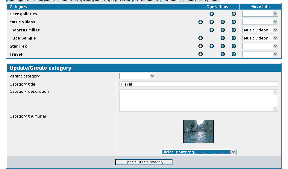 Please note that this screen (as well as the rest of Coppermine's user management) will not be available if you have enabled bridging, because then the user management of the application you have bridged with (e.g. your BBS) kicks in and handles everything related to user management. 4.4.5 Group membershipWhen creating a new user or editing an existing user, you will notice a row named "User group" - it determines what group(s) the user is in. Example: if you want your registered users to be capable of viewing the gallery only, and only privileged users of your custom user group "photographers" are allowed to actually upload files, make all your users members of the built-in group "registered" (by default, they already are). Only for user you want to give the privilege to upload, tick the check box "photographers" as secondary group. Then go to your groups control panel and disallow uploads for the registered group there, but allow uploads for the custom group "photographers". Note: the button "album permission by group" beneath the checkboxes is not meant to assign album permissions, but only to check the permissions set. You can only assign particular album permissions on the album properties screen. 4.5 The categories control panelThis panel allows you to edit your categories.
