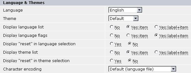 This three-step-process is very helpful: in fact, you only set a default language in Coppermine's config (usually the language the majority of your visitors is speaking) and that's it: if a visitor who speaks another language visits your page, Coppermine's controls will display in his language. Usually, you don't have to provide a language selector on your page (but it's an option in Coppermine's config to display one if you prefer so). The language selector in fact just adds a parameter to the URL, which then subsequently triggers a cookie to be set on the client. You (as Coppermine admin) can accomplish the same by manually adding the parameter to the URL in the address bar of your browser. Just observe how the URL changes on the your coppermine gallery if you have enabled the language selector in coppermine's config to get an idea how this works. When the script auto detects the preferred language, it stores the result in a cookie on the visitor's computer. To reset this cookie (and thus force the script to do another auto detection) the user must call this autodetect function with something like: http://yoursite.com/coppermine_dir/index.php?lang=xxx Once you have added comments or files to your gallery, you should not change the character set of your gallery. If you do so, non-ASCII characters may display properly. Fallback to English if translated phrase not found?Enable this option if you're using languages other than english. If a certain word or phrase doesn't exist within your language file, coppermine will display the equivalent english phrase, instead. This feature has been introduced to allow the use of previous version language files -- language files that may have not been translated for the this version, yet. Until an updated version of the language file is made available, you can use this option. Most translation differences affect the admin part of coppermine only, so the admin will experience most of these untranslated strings. The admin will see some phrases in english instead of his/her preferred language for strings and words that don't exist in the currently available language file. NOTE: this fallback option only works for 95% of all phrases, there may still be some other translation omissions. [cpg1.4.0 or better required] Character encodingThis should normally be set to "Unicode (utf-8)" (or "Default (language file)"). See the discussion in the "language" section of this page. Display language listEnable this option if you want your users to be able to select a preferred language from a dropdown list (you can specify to display only the list itself or a label saying "Choose your language:" in front of the list). Edit your template file (/themes/yourtheme/template.html) to specify where the language dropdown list should appear on your gallery (look for the call tag: {LANGUAGE_SELECT_LIST}). [cpg1.3.0 or better required] Display language flagsEnable this option if you would like the option of having your users select languages appropriate for their use by merely clicking on a flag icon which representing their language or country (you can specify to display the flags themselves or include a label that states: "Choose your language:" in front of the flags). Edit your template file (/themes/yourtheme/template.html) to specify where the flags should appear in your gallery (look for the call tag:{LANGUAGE_SELECT_FLAGS}). [cpg1.3.0 or better required] Display "reset" in the language selectionThis option only applies only if you enabled user language selection - it will show a "default"-icon or list entry to let the users go back to the original language of your gallery. [cpg1.3.0 or better required] 4.12.3 Themes settingsThemeUse this dropdown list to select the default theme for your gallery (Themes are stored in sub-directories of the themes directory ). Display theme listEnable this option if you want your users to be able to select other themes from a dropdown list (you can specify to display only the list itself or a label saying "Choose your theme:" in front of the list). Edit your template file (/themes/yourtheme/template.html) to specify where the theme dropdown list should appear on your gallery (look for {THEME_SELECT_LIST}). This option only makes sense if you have at least one alternative theme in your /themes/ folder other than your default theme. We recommend using this option only if there's are additional benefits for the user (for example a theme with less graphics in it that loads faster for users on a dial-up connection, or a theme with reduced color pallettes and good contrast). [cpg1.3.0 or better required] Display "reset" in theme selectionThis option applies only if you enabled the user theme selection option - it will show a "default" list entry to let the users go back to the original theme of your gallery. [cpg1.3.0 or better required] Display FAQThis option adds a "FAQ" link to the menu bar when enabled. If a user clicks on it, it will display a list of "Frequently asked question" on how to use coppermine. To change the content of the FAQ, edit the file /your_coppermine_folder/lang/yourlanguage.php (e.g. english.php) and look for // ------------------------------------------------------------------------- // // File faq.php // ------------------------------------------------------------------------- // Edit the content that comes after it. [cpg1.3.0 or better required] Name of your custom linkUse this if you want to create a custom link that will appear in the menu. What you enter here will be the name of the menu link or button. Leave space blank if you do not have any specific use for it. [cpg1.4.0 or better required] URL of your custom linkThis is the URL where the user's browser will be directed to when s/he clicks on the "Custom link name" button in the main menu. You can use any valid URL. Leave this blank if you do not have any specific use for it. [cpg1.4.0 or better required] Display bbcode helpWhen enabled, this will display the bull