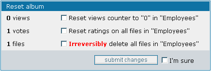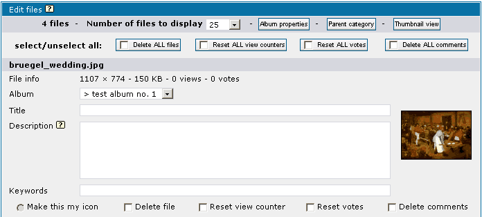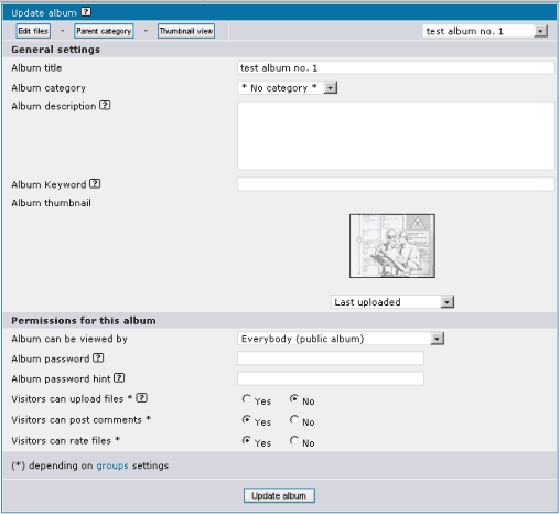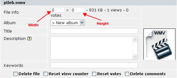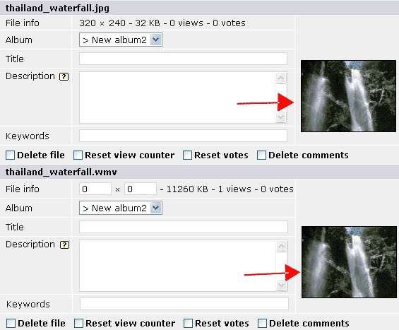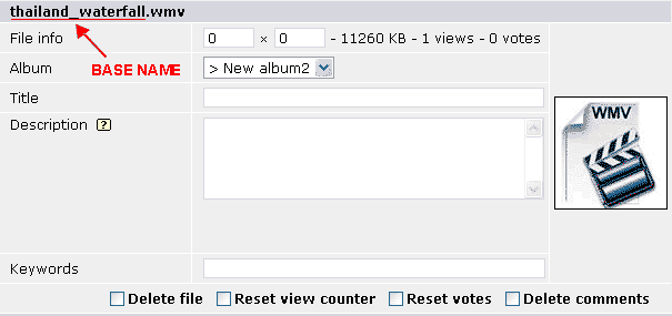 4.7 Modifying albums/filesWhen you are in admin mode there is a menu displayed next to each album Delete allows you to delete the album and (CAUTION) all files within it. Properties allows you to modify the name, description and permissions of the album Edit files allows you to modify the title/caption/keywords etc... of the files in the album 4.8 Album propertiesThe "Album category" drop down list allows you to move an album from one category to another. If you set this to "* No category *" then the album will be displayed on your main page. Use bbcode to add links and additional formating to your descriptions. The thumbnail option lets you select the picture that will represent the album in the album list. Do not assign a picture here if you would like the album to select images randomly. If you have set "Users can can have private albums" to YES on the config page, you can determine who will have permission to view the files of this album. When "visitors can upload file" is set to YES, it is possible for them to upload files into albums by enabling this permission. Note that only visitors who are members of a group for which the setting "Can upload pictures" is set to YES. Members not in the permitted group will not be able to upload files into such an album. Non-registered users are members of the "Anonymous" group. The same rules as above apply for "Visitors can post comments" and "Visitors can rate files". In 1.4.x the Album Keyword is no longer being used for searching purposes, but, rather, to link images from other album into another. Using this method, files/images can be displayed in various albums while the file itself need only exists in one album on your webserver. You simply upload a file to one album as you would normally do, then assign one or more keywords to the file. The keyword function reads blank spaces between words as a 'break' and assumes that these words are separate words. If you must use phrases for your keywords, connect them with an underscore or by using the ascii space holder ctrl+Alt+0160 (NOTE: the latter option only works with latin based character sets.) Each album can only have ONE (1) keyword or keyword phrase. All pictures residing in different albums that you would like to be displayed in this album must have the same keyword or keyword phrase in their respective keyword fields. Pictures, unlike albums can have multiple keywords or keyword phrases separated by spaces. This provides you with the option to display pictures in many albums. For the visitor of these albums, it will appear as if the file/image had been uploaded to each. Album Password: you can specify an album to be password-protected (instead of relying on the "regular" group-based permissions). This way, you can even allow access for unlogged users (guests) who you provide the password to. Use this option, for example, to set up an album for your family members only by specifying a password that only they can come up with answering an additional password hint (e.g. "What was the maiden name of aunt Emma?"), or you could decide to send the particular password to specific friends, family or business associates by email. The optional password hint will be displayed at the password prompt, when set. Note: when setting an album password, the permission dropdown field "Album can be viewed by" will be switched automatically to "me only" - this is expected behaviour. If you change the "Album can be viewed by" to another selection, you must disable the album password as well. 4.8.1 Reset album properties![]() You can reset the number of views count and total ratings in the album properties panel and even delete all pics at once in the sub-section "Reset album" by ticking the desired checkboxes and then submitting the form. To prevent accidental resets, you will have to place a tick on the checkbox "I'm sure" before changes can be submitted (the button will be greyed out (disabled) if you don't). Use these options with care: the deleting of files is irreversible, as well as the reset of views and ratings (you can only restore views and ratings by manually editing coppermine's database entries with third-party tools like phpMyAdmin - not recommended). 4.9 Editing filesUse this link to modify your file's title, description, keywords, and custom fields (if they are used). Use the album drop down menu in the panel to move the file between albums. Use keywords to link files to other albums (see description in the albums section above). 4.9.1 Editing videosHere, you can modify the title, description, keywords, and custom fields (if they are used) of your video files. Use the album drop down menu to move the video to another album. Use the height and width fields to set the size of the video. Video uploads are possible beginning with cpg1.3.0 (or latter) and are included as part of the distribution package. For cpg1.2.1 you must install a separate modification. [cpg1.3.0 or better required] 4.9.2 Custom ThumbnailsOrder of thumbnails: Types of thumbnails: Extension-specific thumbnails are named after the extension of the file. (Examples: 'thumb_wmv.jpg', 'thumb_wav.jpg'.) The base name for media-specific thumbnails are 'thumb_movie', 'thumb_document', and 'thumb_audio'. Images use file-specific thumbnails by default. Uploading: 1. Have an image already uploaded then upload a video via the upload page. (or vice versa) The video will share the thumbnail of the image. 2. FTP upload both the video and (thumbnail or image) then batch-add. If you FTP upload the thumbnail, the thumbnail will be display in the batch add page instead of the default Coppermine thumbnail. If you upload an image it will look like the above screenshot. However, when the both files are added to the database, the thumbnail of the image will be used by the video. Final result. Note: If the first method is used and the image later deleted, the thumbnail will also be deleted and the default Coppermine thumbnails will be displayed, inste