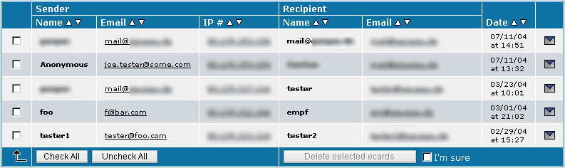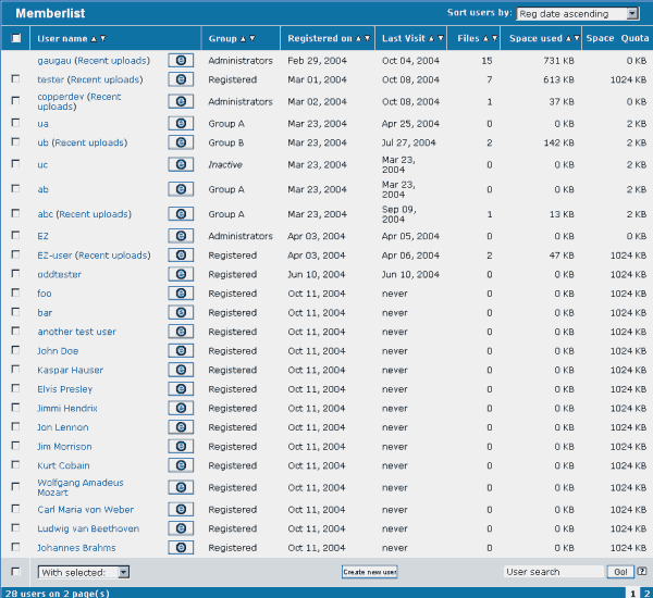 No. of boxes set to "variable" allows the user to select the number of upload boxes for an upload. Usually, you will leave this option set to "fixed", as it presents the user with an additional step in the upload wizard that is not necessary. File upload boxes controls the number of file upload boxes presented to the user. If the user may customize the number of boxes (No. of boxes set to "variable"), this setting serves a maximum limit for the number of boxes he may request. Otherwise, this setting determines the number of boxes that will appear on the upload form. URI upload boxes is the same type of control as File upload boxes, but it controls the presentation of URI upload boxes. Please note: on unbridged installs (or standard, stand-alone coppermine installs), the group "banned" feature really doesn't accomplish much. A user who is member of this group is still able to log in and view pics, he's just not able to upload, rate, send ecards or post comments. If you truly want to place a full ban on someone you should use the "banning" feature (which isn't group-based but individually based), instead. 4.4 The user control panelThe user control panel can be found when clicking "users" from the admin menu. It is the place where you create and manage your users. If you have enabled integration (bridging) Coppermine with another application (e.g. your favorite BBS app), Coppermine will use the member table of the application you bridged with (your BBS), so the built-in Coppermine user management will be disabled in favor of the user management that comes with the bridged application. This has been incorporated to eliminate redundancy and facilitate a seemless integration. As a result, you will not have this user control panel; clicking the "users" link will send you to your bridge application's user management instead. ![]() 4.4.1 Page controls
