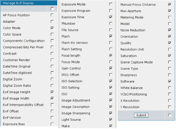 of the visitor. As the statistics are being kept per file, the link to the stats can be accessed on the individual file's page (displayimage.php) by clicking the link in the file info section to open the stats pop-up. Note: The total hits may not match if you enable details and do not reset the earlier hits. 4.12.16 Miscellaneous settingsEnable debug modeCPG will show error messages which are normally suppressed. This is helpful in troubleshooting problems with your gallery or when asking for help on the CPG Support Forums. Turn this feature off if you don't experience problems. Turn it on (option "Everyone") if you are requesting help on the coppermine support board, so the supporters can have a look at the debug output as well. Choose the option "Admin only" when troubleshooting on your own - debug output will be only visible when you're logged in as admin, regular users or guests won't see the debug output. Display notices in debug modeMay be helpful to troubleshoot problems with your coppermine install - only recommended if you know a little PHP and you can understand the additional error messages this option shows. This option only applies if debug mode is enabled. Gallery is offlineIf you have to do maintenance work on your gallery, switch it to offline mode. Only members of the admin group will be able to log in, all other users will only see "Gallery is offline". Remember to switch this option off once your maintenance work is done. [cpg1.3.0 or better required] 4.13 EXIF dataThe "Exchangeable image file" format (Exif) is a specification for the image file format used by digital cameras with the addition of specific metadata tags. The meta data are written by the camera and can be post-processed using certain desktop applications. Coppermine is capable of displaying some of the EXIF data within the pic info section, like date and time information, camera settings, location information, descriptions and copyright information. 4.13.1 EXIF manager