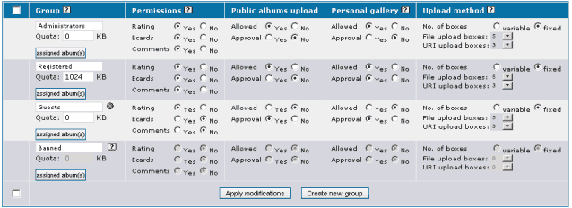 4.3 The group control panelThis is where you define what members of a user group can and can't do. The disk quota applies only for groups where "Personal gallery" has been set to "Allowed". Both files uploaded by a user in his personal gallery as well as files uploaded to public galleries are included in the quota. Use the anonymous group to define what non-registered users can and can't do. Quota and "Personal gallery" are meaningless for anonymous users. Permissions control what the user is allowed to do in the gallery (Rating/Sending Ecards/Posting Comments). Bear in mind that if a user is a member of a group where "Rating", "Comments" or "Public albums upload" is set "YES", s/he will have the right to perform these operations only in albums where they are allowed. ( ie. uploading files will only be possible in albums where "Visitors can upload files" has been set to YES.) If "Personal gallery" is set to Allowed, the members of the group will be able to have their own gallery in the "User galleries" category where they will be able to create their own albums. If "Approval" is set to NO, files uploaded by members of the group in albums created in their own gallery won't need to be approved by the admin. If "Approval" is set to YES, the users in the particular group will be able to upload, however the uploaded files will only be shown after the admin (you) has approved them. The group control panel enables you to control the upload parameters of any group. Upload method lets you select the type of upload method that a particular group may use. Four forms or methods are currently available.