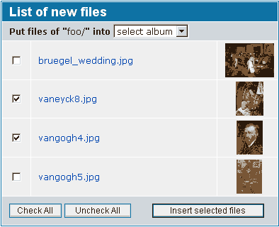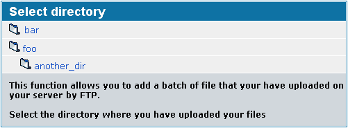 4.11 Uploading pics/filesThere are several methods to upload files within Coppermine. You (as gallery admin) should use FTP-upload plus batch-add (only the admin can do this). Regular users are supposed to use the "regular" http upload or (if they have Windows XP) the XP Publisher. 4.11.1 Uploading pics by FTP / Batch-Add PicturesIt is recommended that the coppermine admin use ftp to upload multiple pics/files at a time. Use your ftp software to create sub-folders within your_coppermine_directory/albums/, where your ftp uploads can be saved. Though not mandatory, it's always a good idea to have a folder structure within the albums folder that reflects or mirrors your coppermine categories and albums. Important: do not create folders or ftp upload to the userpics- nor to the edit-folder by ftp: these folders are used by coppermine internally and must not be used for any other purpose! Folder names must not contain dots. We also highly recommend refraining from the use of any other special characters - use only a-z, numbers and - (dashes) or _ (underscores) to fill blank spaces. Make sure to upload in binary or auto-mode. Once you have uploaded your photos by ftp, click on the "Batch Add Pictures" button. The batch-add is performed in three steps: