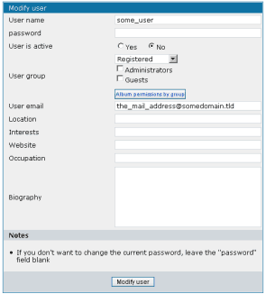 4.4.2 Searching for user(s)You can use the wildcards: * (for any string) and ? (any single character) or even %expression%. 4.4.3 Creating new usersTo create a new user, simply click on the button "Create new user" at the bottom of the user manager and fill in the form that will come up. This does of course not apply if you have bridging enabled, as user management is being handled by the app you have bridged coppermine with. In this case, the user management screen of your bridged app should show - create a new user there. 4.4.4 Editing users