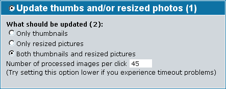 Use dimension ( width or height or Max aspect for thumbnail )Sets the dimension (height or width) on which the maximum pixel size limitation should apply to. When changing this setting, only files that are added after the change will be affected. Therefore, it is advisable that this setting not be changed after photos have already been added to the gallery. You can, however, apply the changes to the existing pictures with the "admin tools (resize pictures)" utility from the admin menu.