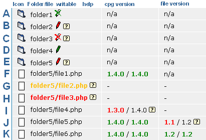 As you can see, the coppermine dev team is constantly fixing and improving coppermine. Every non-trivial piece of software contains bugs, so there is no guarantee that the version that currently is the most recent one will be the final, ultimately bug-free version to be released in the cpg1.4.x series. It is absolutely vital that you perform regular updates as soon as new packages are being released. 3.2.2 ChangelogDetails on the changes that went into a release can be found in the changelog that comes with each package. The changelog file can be found in the root directory of the coppermine package. The changelog contains more information on additional languages and the time and date of the fix as well. The changelog is a plain-text file that can be read using a simple editor - on Windows-driven machines, notepad.exe is fine. 3.3 The version check toolSince the release of cpg1.3.2 Coppermine comes with an additional version checking tool to help you resolve issues with upgrades and updates easily. Except for specific files of coppermine that will only work for the version that it had been originally designed for, the versioncheck tool can be used with all versions starting from cpg1.2.1. To launch the versioncheck, simply add versioncheck.php to your browser's address bar after being logged into coppermine as admin (example: http://yourdomain.tld/your_coppermine_folder/versioncheck.php). With version 1.4x, you can run the versioncheck utility from the Admin Tools menu. 3.7.1 What it doesThe script "versioncheck" is meant for users who have updated their coppermine install. This script goes through the files on your webserver and tries to determine if the local file versions on your webserver are the identical to the ones at the repository of http://coppermine.sourceforge.net. Files that do not match are displayed and are the files you should update as well. In Cpg1.4.x you can toggle the URL to the latest update for individual files in the versioncheck page. It will show everything in red that needs to be fixed. Entries in yellow need looking into. Entries in green (or your theme's default font color) are OK and should be left alone. When an entry is red or yellow, a help icon will appear next to it. Click it to find out more. Hovering with your mouse over an item will display additional information as well (tooltip). The versioncheck screen has several sections: