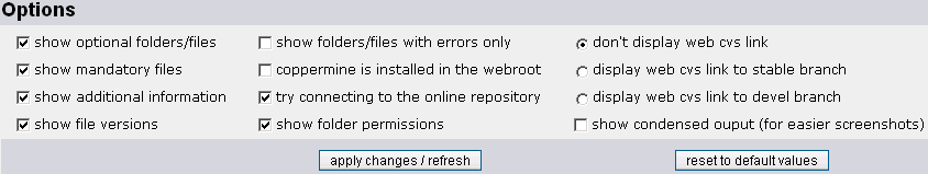 3.3.2 OptionsThe options screen lets you configure the versioncheck, or rather what is being displayed. The options aren't saved anywhere, so you will have to adjust them each time you run versioncheck. The default options should be OK for most users - only change them if you have good reasons to do so. ![]()